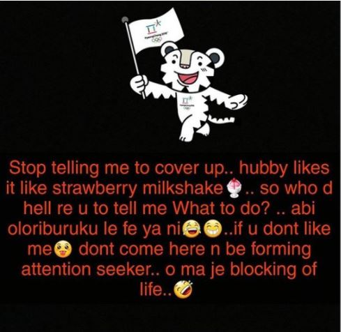 "Stop telling me to cover up.. hubby likes it like strawberry milkshake.. so who d hell re u tell me What to do? .. abi oloriburuku le fe ya ni... if u don't like me dont come here n be forming attention seeker... o ma je blocking of life.."she posted on social media.